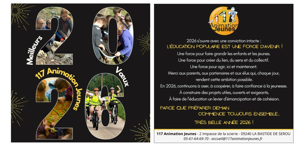 La Présidente de 117 Animation Jeunes, les membres du conseil d’administration et du bureau, le Directeur de 117 Animation Jeunes et les équipes de professionnels, les enfants et les jeunes, vous présentent leurs meilleurs vœux 2026 !