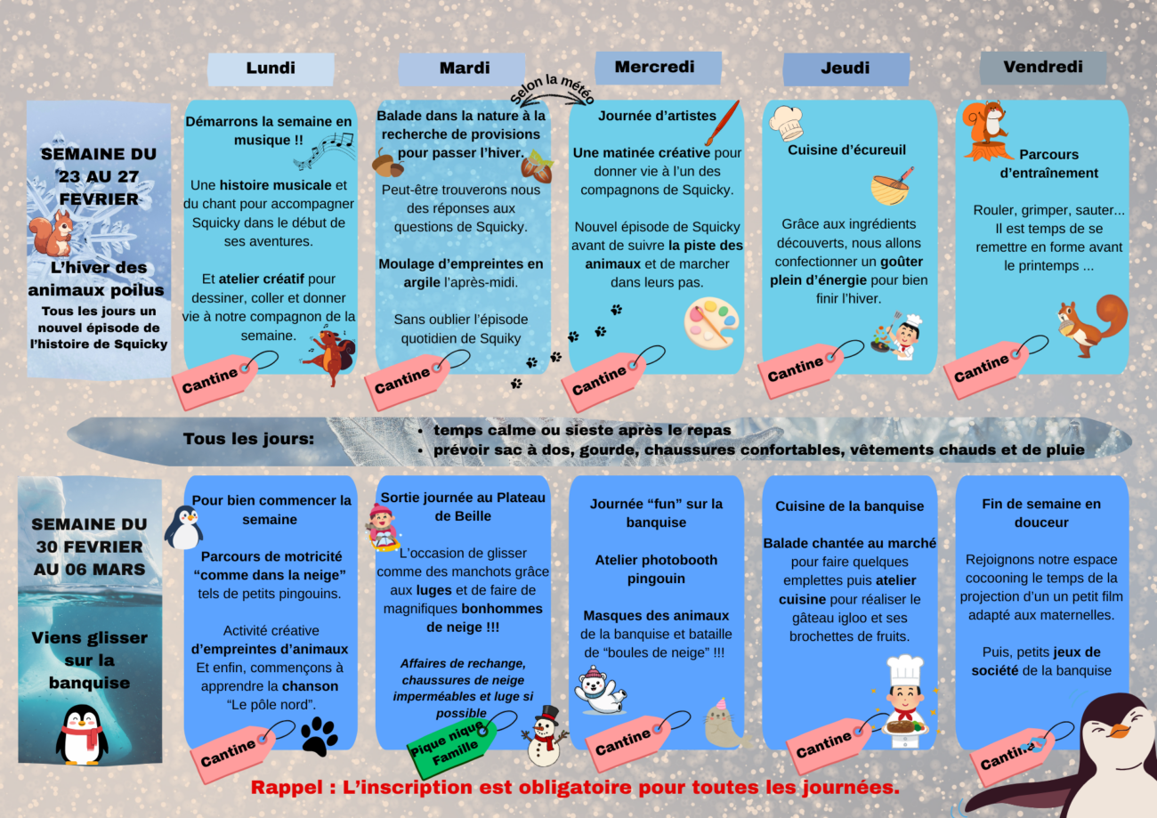 A l’occasion des vacances d’hiver nos accueils de loisirs extrascolaires seront ouverts du lundi 23 février au vendredi 6 mars, à La Bastide de Sérou, du lundi au vendredi de 8 h à 18 heures.