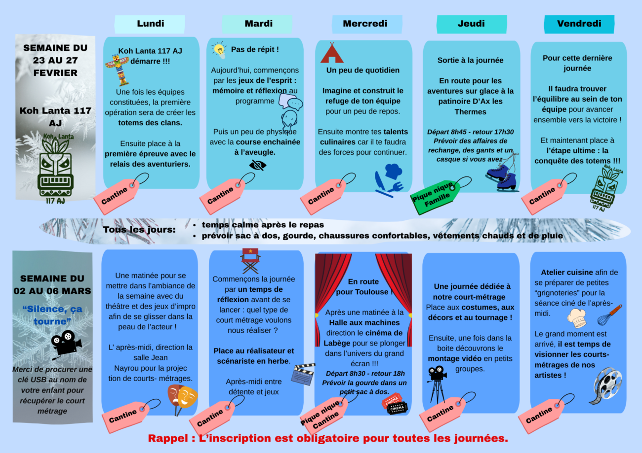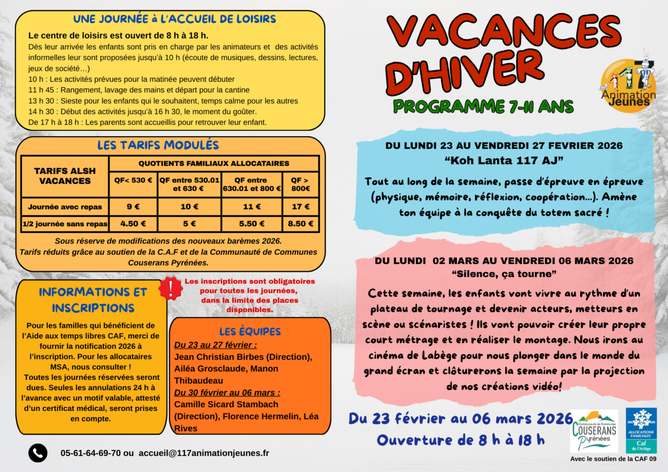 Inscriptions et réservations au 05-61-64-69-70 ou par mail accueil@117animationjeunes.fr