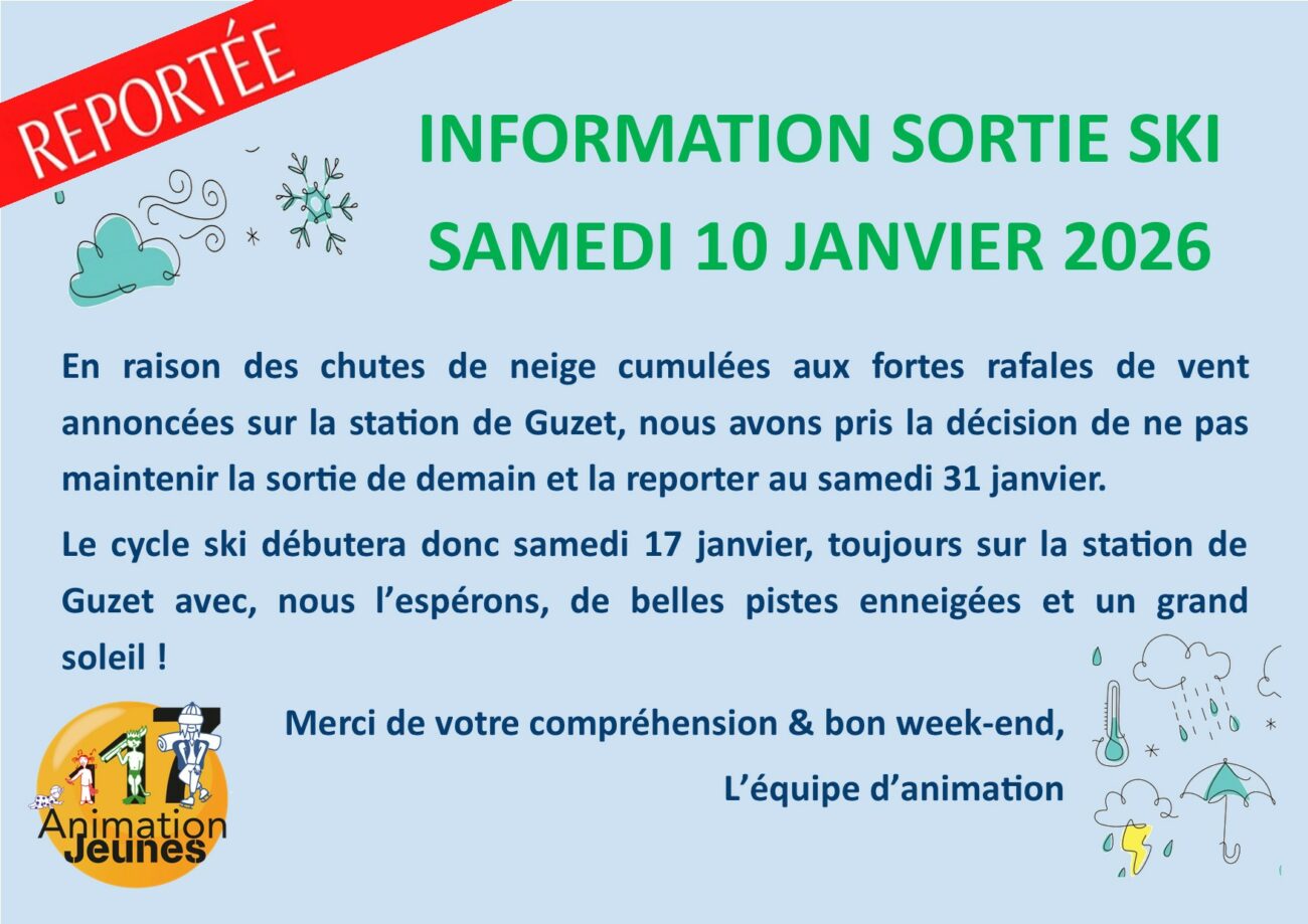 Nous sommes dans l’obligation d’annuler notre sortie ski prévue demain, samedi 10 janvier sur la station de Guzet.
